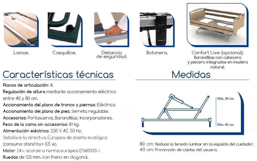 Apropiadas para usuarios válidos y asistidos presentando la ventaja adicional de ofrecer mayores niveles de comodidad . Además, gracias a sus casquillos especiales, permiten ir incorporando diversos accesorios en función de las necesidades cambiantes de las personas mayores. Dos motores de alta potencia y estructura reforzada sin posibilidad de atrapamiento de extremidades. Estructura de acero con recubrimiento Epoxi de alta durabilidad y fácil limpieza. Motores independientes para tronco, pies y AutoContour (respaldo y piernas sincronizado). Lamas de haya laminada extra-gruesas. Disponibles accesorios como incorporador de paciente , porta sueros, barandillas, cabecero y piecero... Los pies incorporan ademas del mecanismo eléctrico otro de posicionamiento manual de inclinación muy útil. MEDIDA ÚNICA 90X190 |